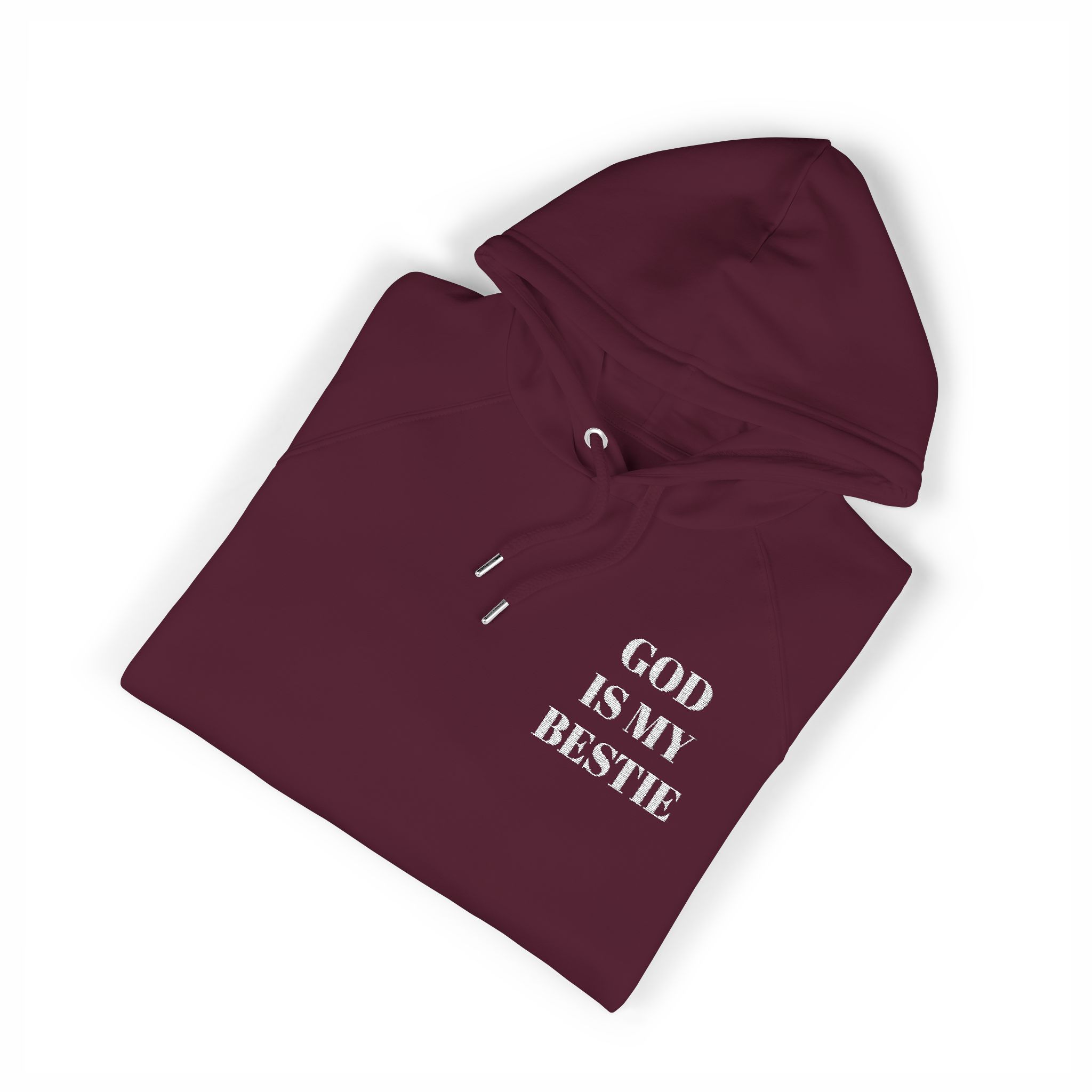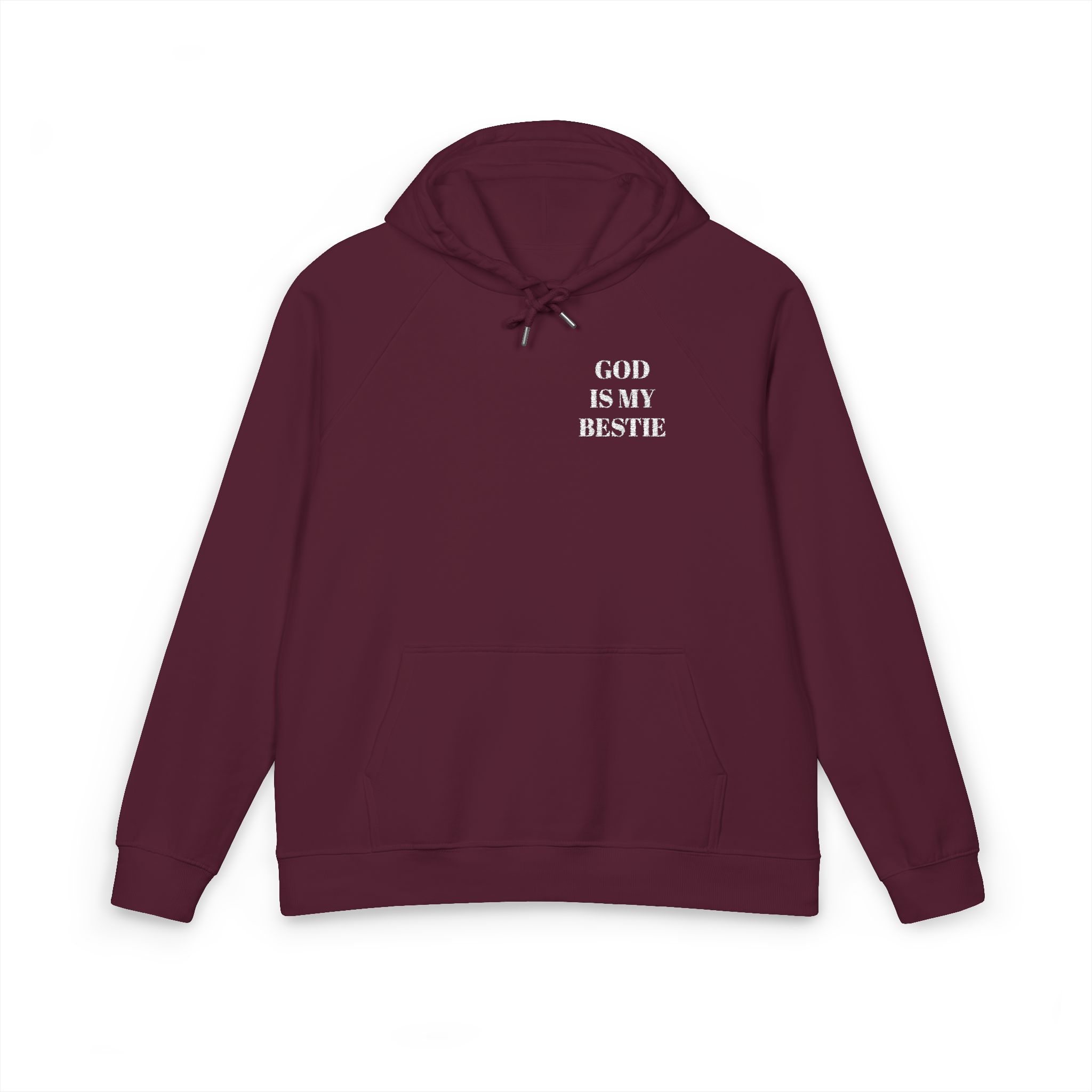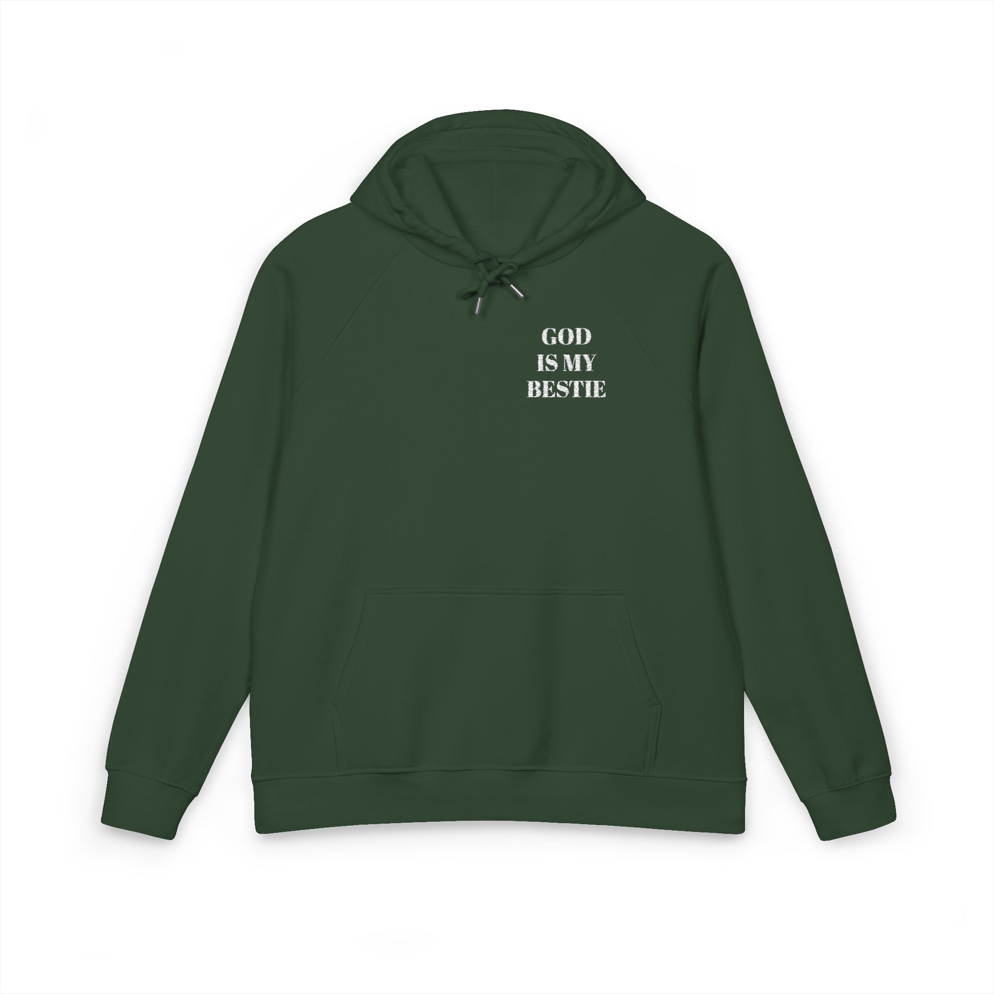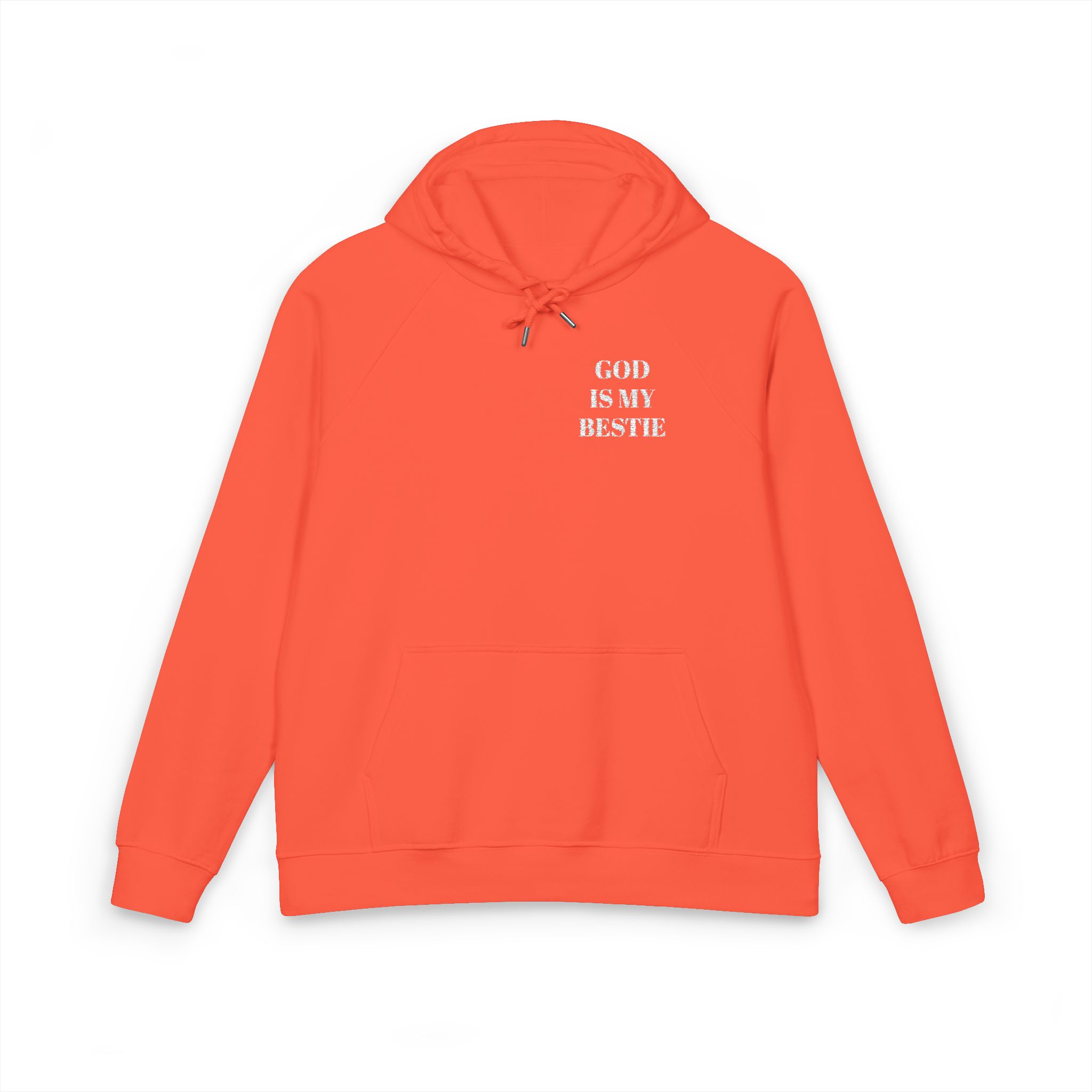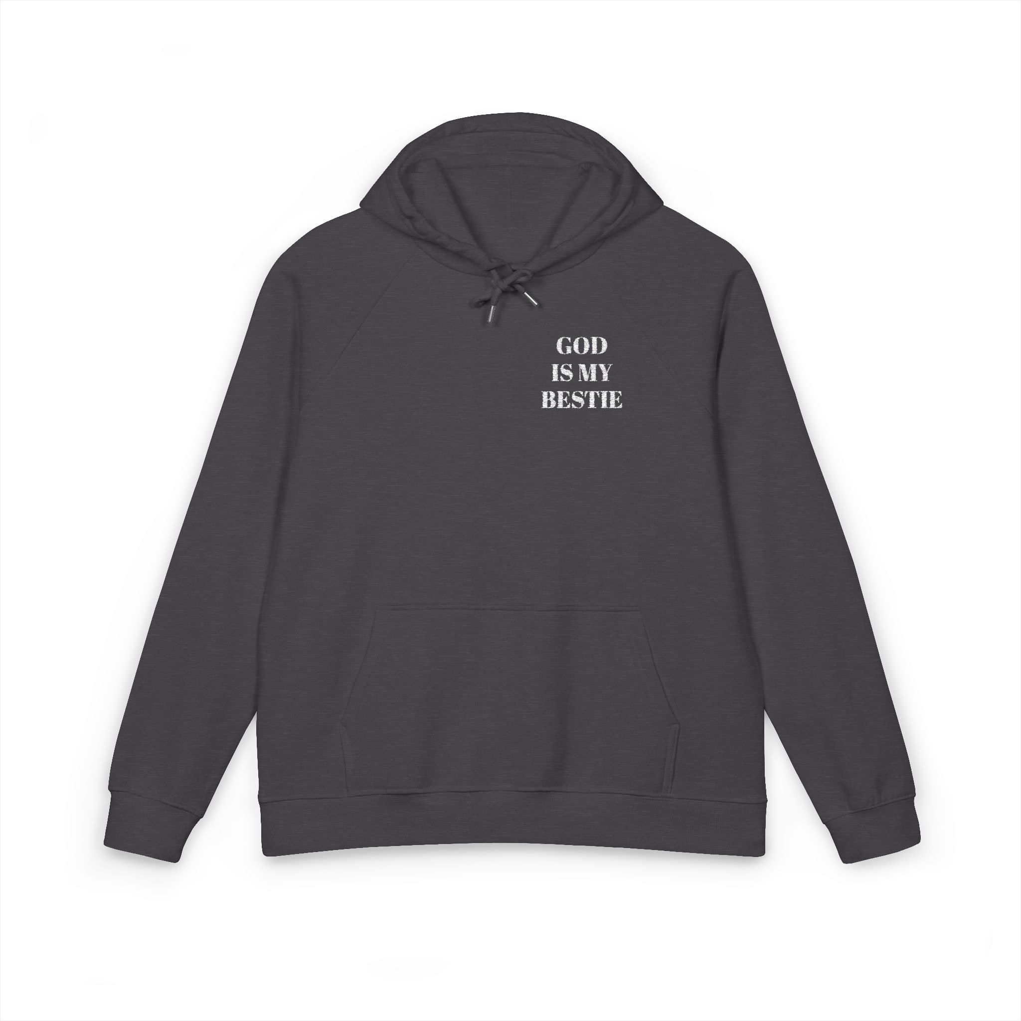 Wear your faith with quiet, joyful confidence. This eco raglan hoodie carries the bold embroidered message ‘GOD IS MY BESTIE’ over the chest, a gentle declaration that starts conversations and warms hearts. The brushed internal lining and soft organic cotton blend cocoon you on cool mornings and late-night runs to the coffee shop. Raglan sleeves give movement-friendly comfort whether you’re folding hymnals, chasing kids, or pausing for a prayer at sunset. Subtle details — metal eyelets, jersey-lined hood, and neat ribbed cuffs — keep the look thoughtful, not flashy. For people who live their faith out loud but with sincerity, this hoodie becomes part of everyday rhythms: Sunday strolls, community volunteer days, and tucked-in moments of gratitude.